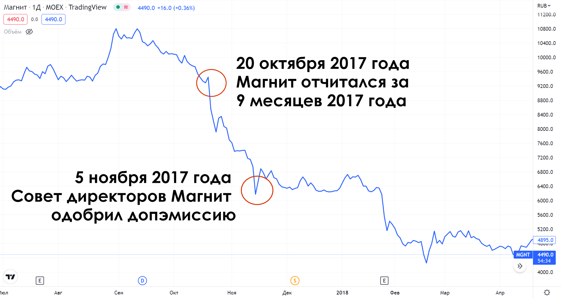 В октябре 2017 года ритейлер «Магнит» отчитался за девять месяцев 2017 года. Прибыль компании упала на 32%. Реакция инвесторов на отчетность видна на графике ниже. Чтобы восстановить показатели, необходимо развивать бизнес, модернизировать магазины и оборудование. В ноябре компания решила провести допэмиссию. Инвесторы снова негативно отреагировали на эту новость, и акции «Магнита» продолжили падение. Всего за несколько месяцев их цена сократилась в два раза.