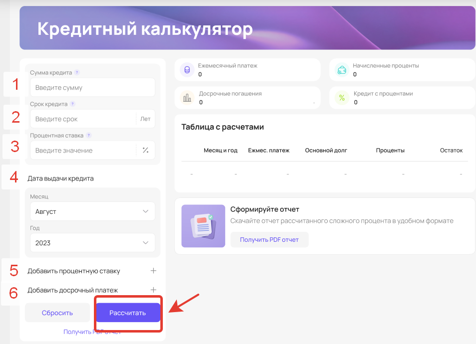 Заполнить кредитный калькулятор легко. Нужно знать 6 параметров: