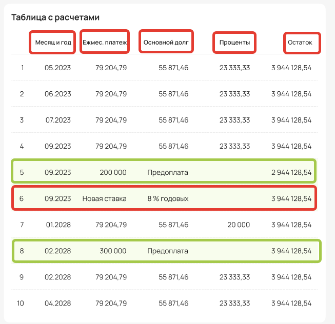 Если процентная ставка изменилась, то вы увидите её в графике. После чего, долг, проценты и остаток, автоматически пересчитаются.