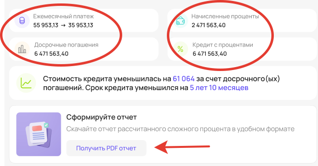 На этой же странице вы найдёте информацию, насколько снизилась сумма кредита и срок, за счёт досрочных погашений. После расчёта, сформируйте отчёт и скачайте его на телефон.