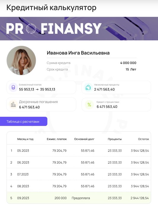 Для расчёта экономии на процентах, заёмщик использовал кредитный калькулятор с досрочным погашением pro.finansy. Калькулятор рассчитал, что герой снизит стоимость кредита на 200 000 руб. за счёт досрочных платежей, а сам срок кредита снизится на 3 года.